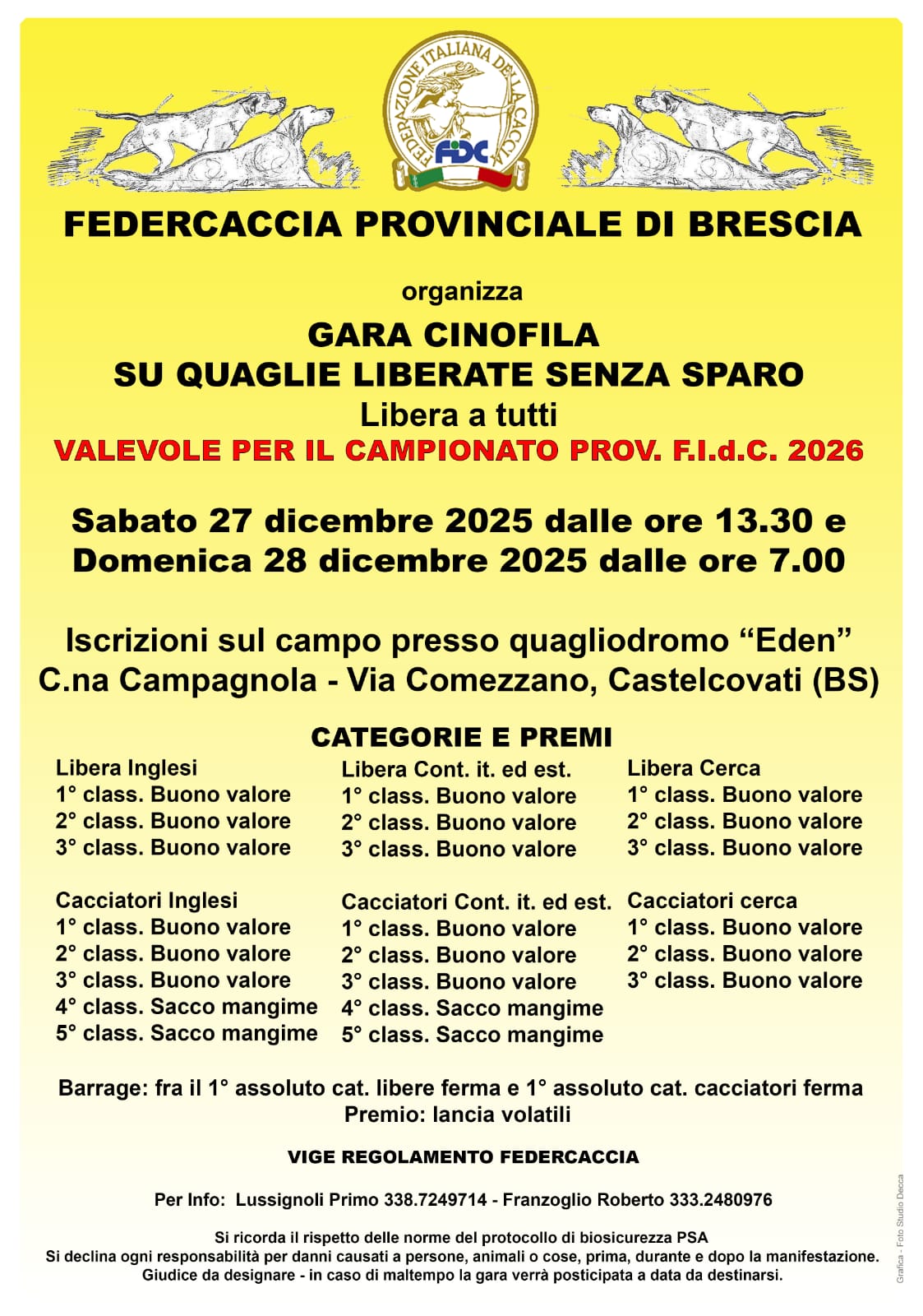 La prova è riservata ai federcacciatori bresciani in possesso di un cane da ferma o da cerca, iscritto o meno ai libri genealogici dell’E.N.C.I., muniti di: licenza di caccia con versamenti in corso di validità, polizza assicurativa valida.